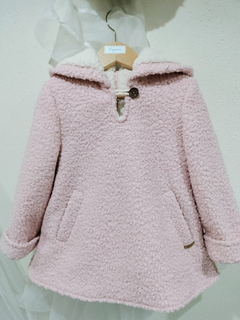 Abrigo canguro para niña, de tejido de baguilla color rosa empolvado, muy abrigadito y forrado en borreguito beige.
