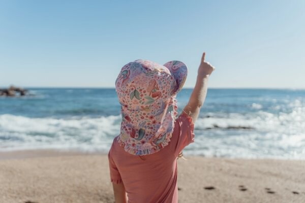 Gorro baño niña fondo rosa y estampado marino con sirenas.