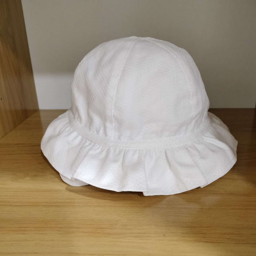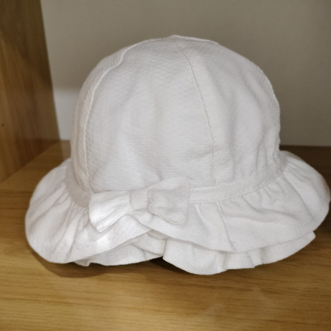 Pamela  de bebé  de tejido piqué blanco con ala plisada y adorno de lacito.