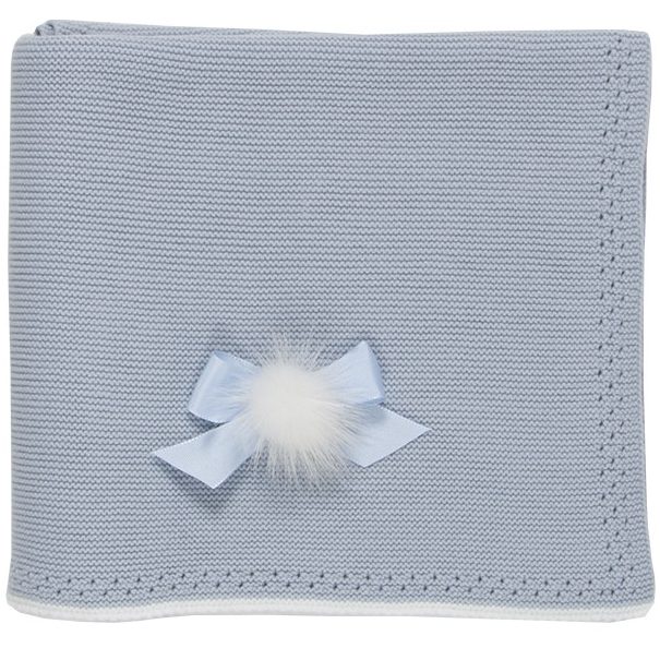 Manta de punto de color celeste empolvado confeccionado en dralón 100%. Esta fibra está especializada en el cuidado de la piel del bebé.