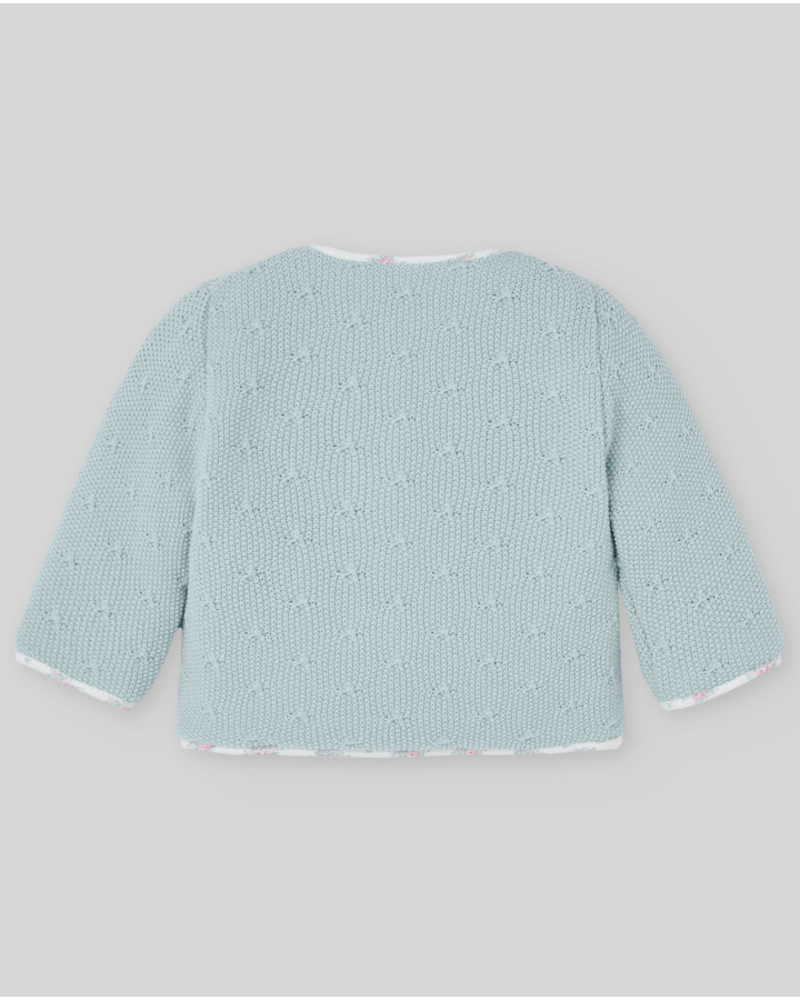 Chaqueta para niña combinada en punto de color verde tiza por un lado y por el otro tejido de viella de flores.