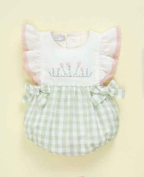 Ranita confeccionada en delicado tejido de cuadro vichy verde, con canesú bordado y volante en las mangas. Cierre trasero con botones.
