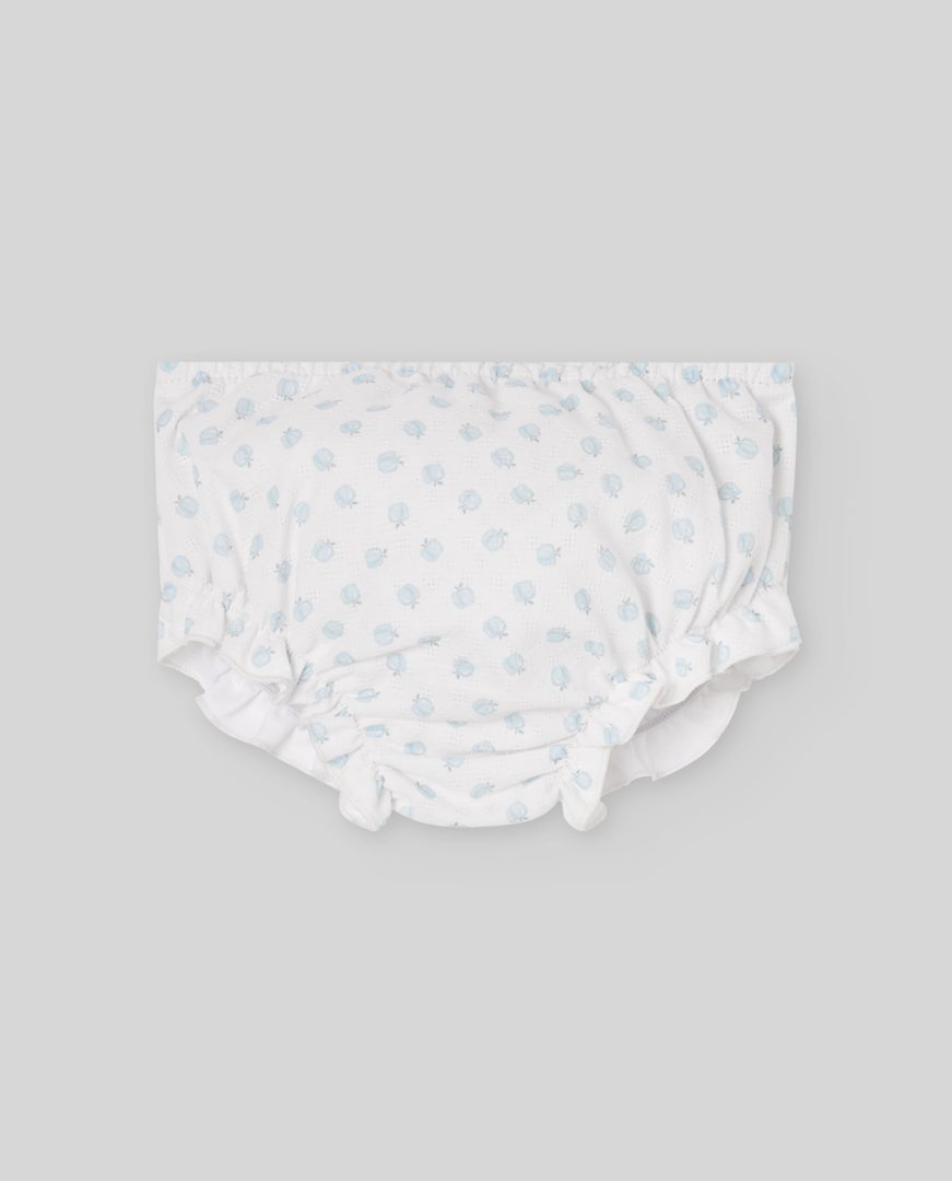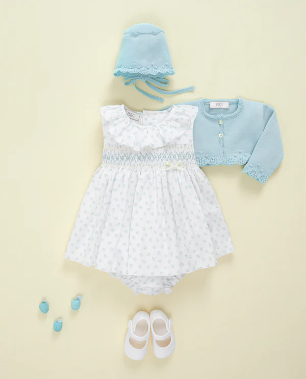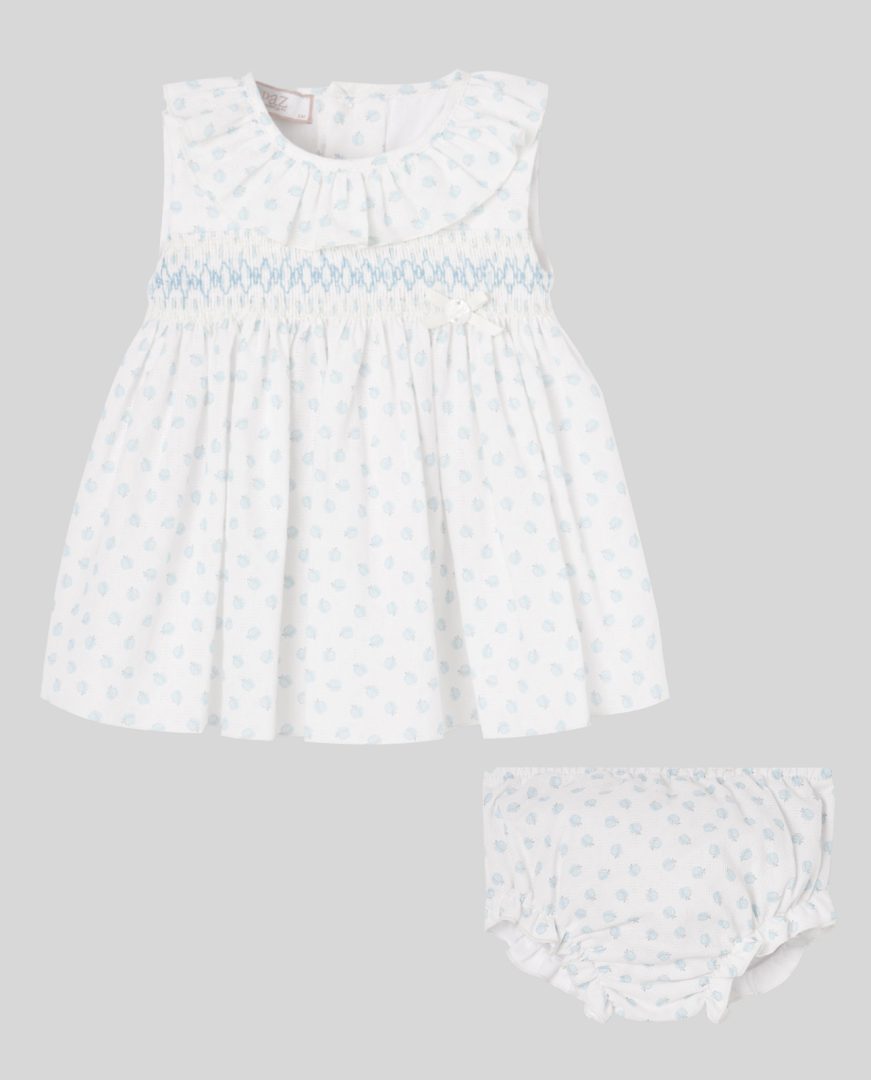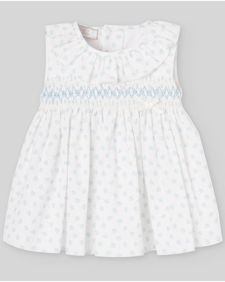 Vestido confeccionado con delicado tejido blanco estampado de manzanitas azul brisa. Cierre trasero con botones,