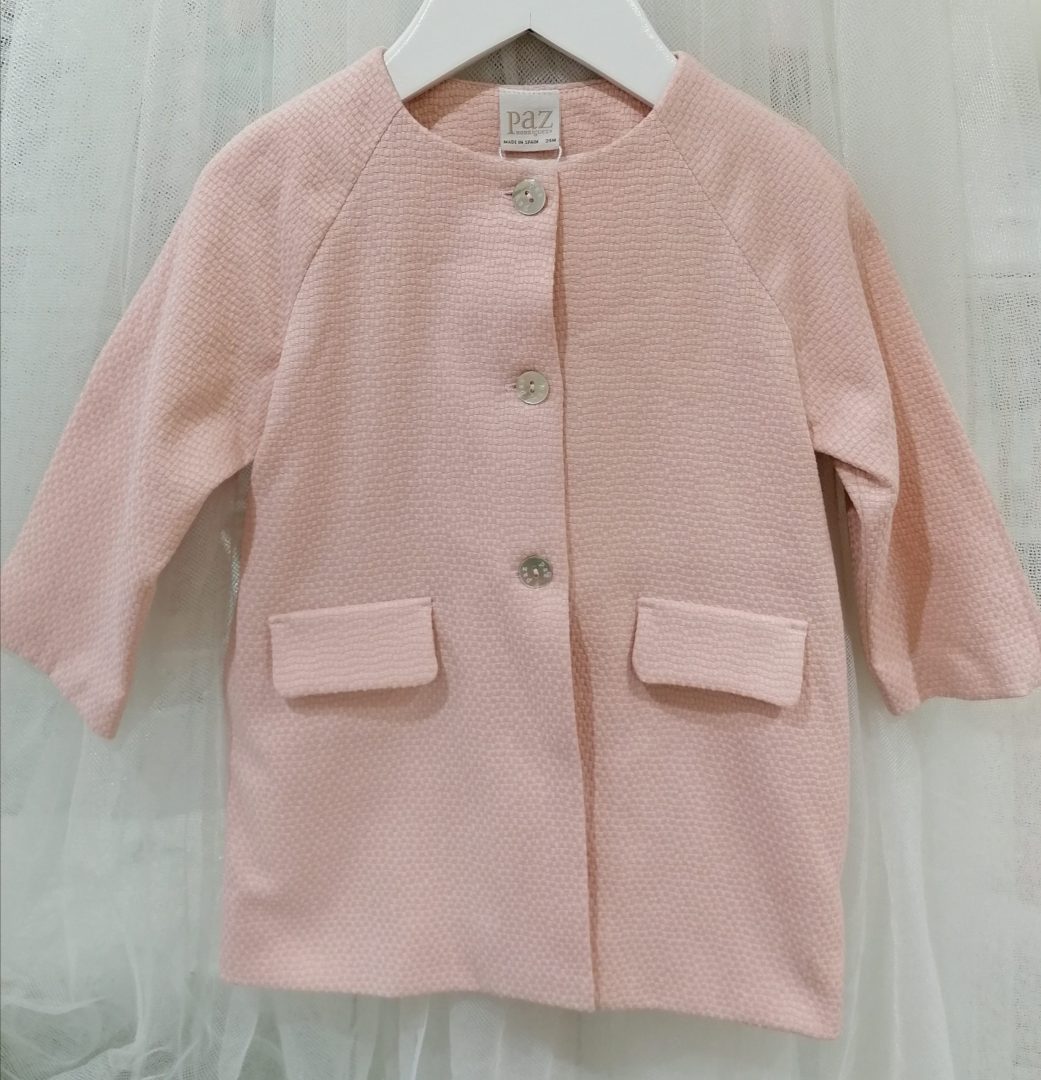 Abrigo de piqué rosa empolvado, ideal como prenda de entretiempo.