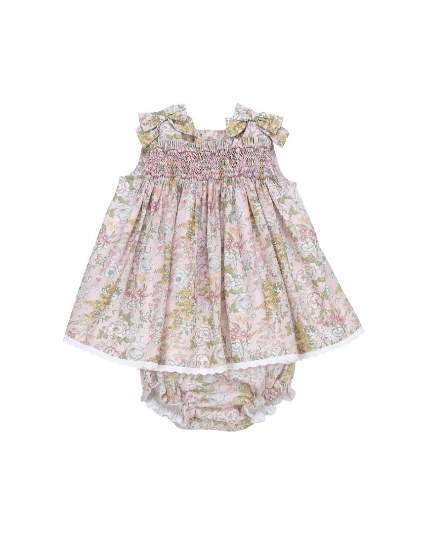 Detalle de punto nido de abeja y pequeñas flores bordadas a mano.