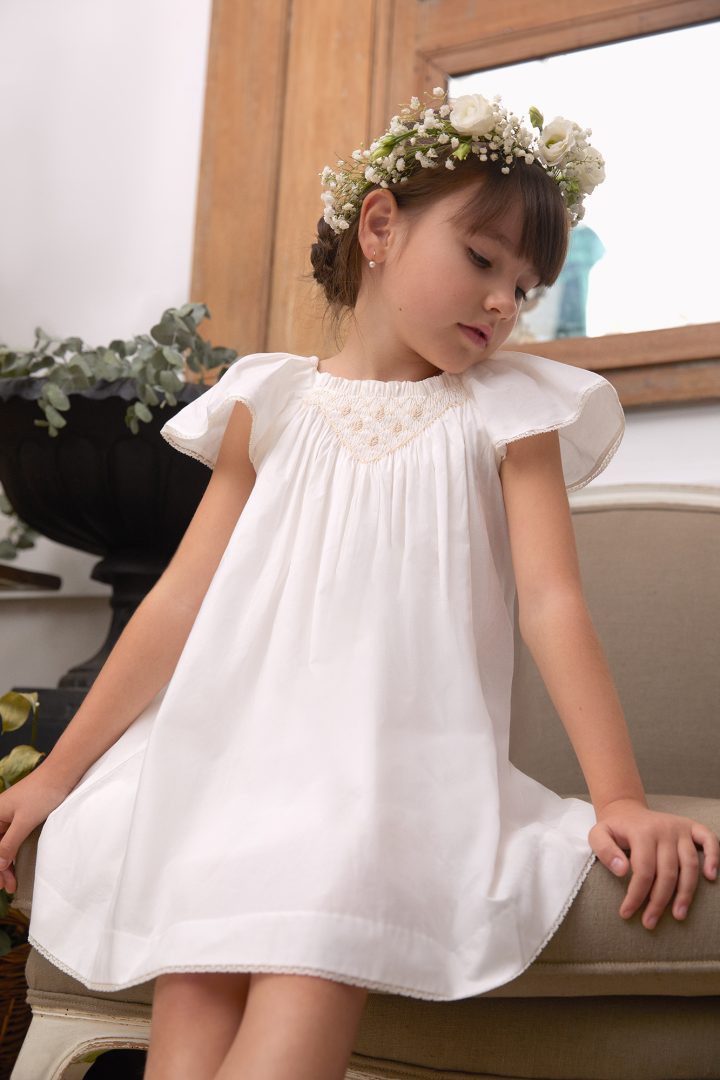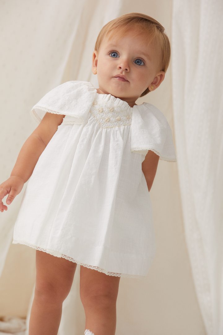 Vestido  confeccionado con delicado tejido de batista marfil.