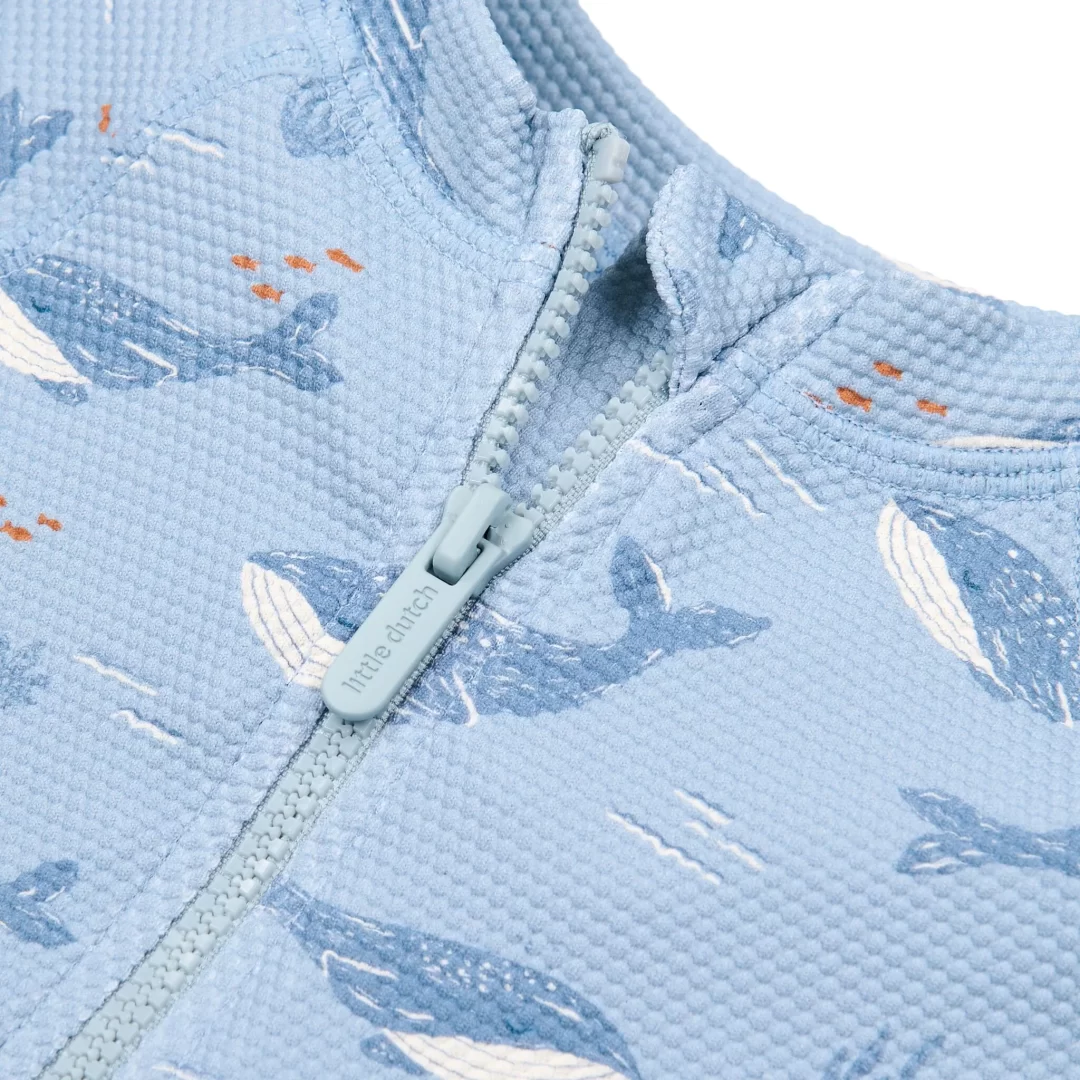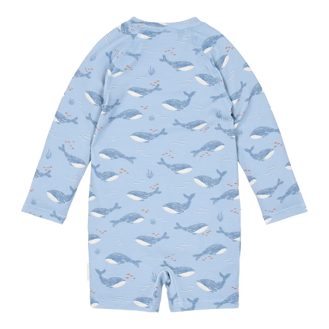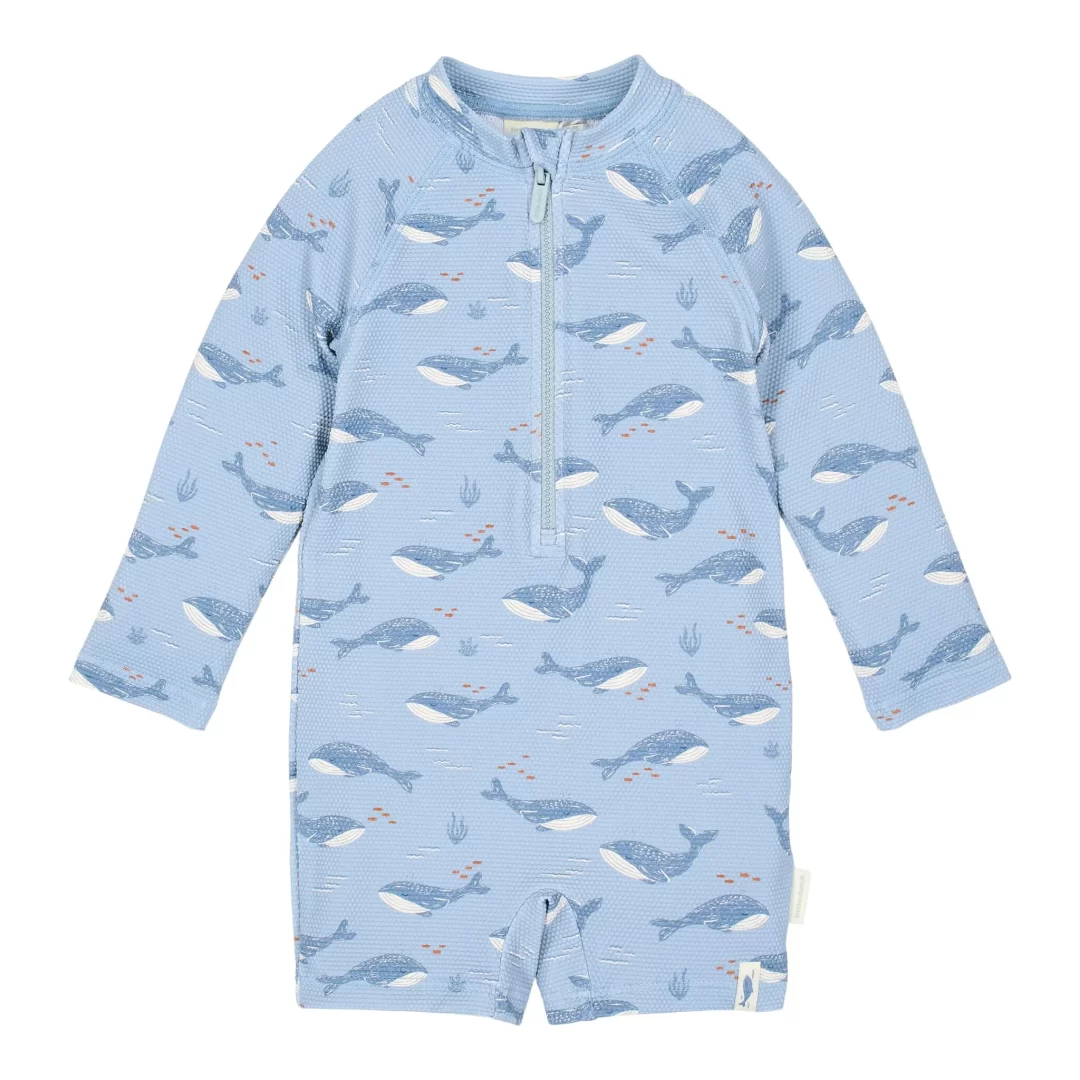 Traje de baño niño fondo azul y estampado marino.