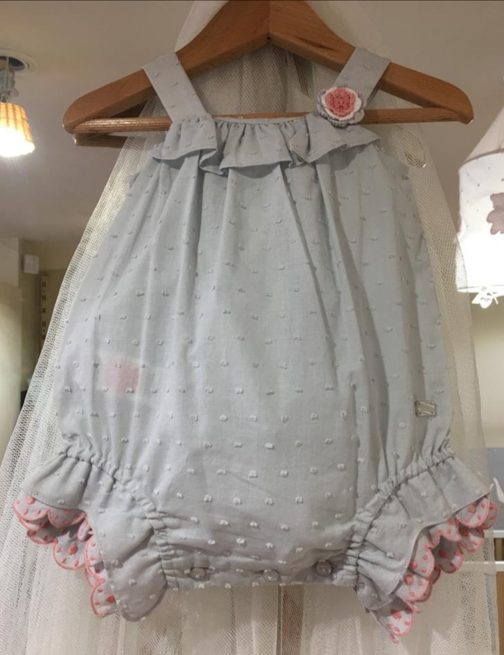 Ranita niña tirantes confeccionada en tejido verde mar bordado con detalles en color rosa.